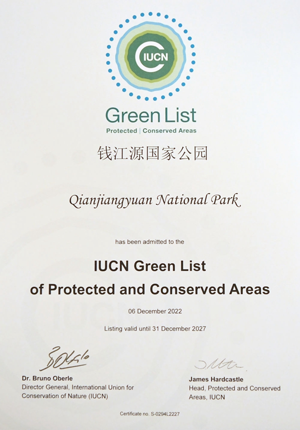 这是在加拿大蒙特利尔拍摄的钱江源国家公园获得的世界自然保护联盟绿色名录证书(2022年12月14日摄)。新华社记者 任鹏飞 摄