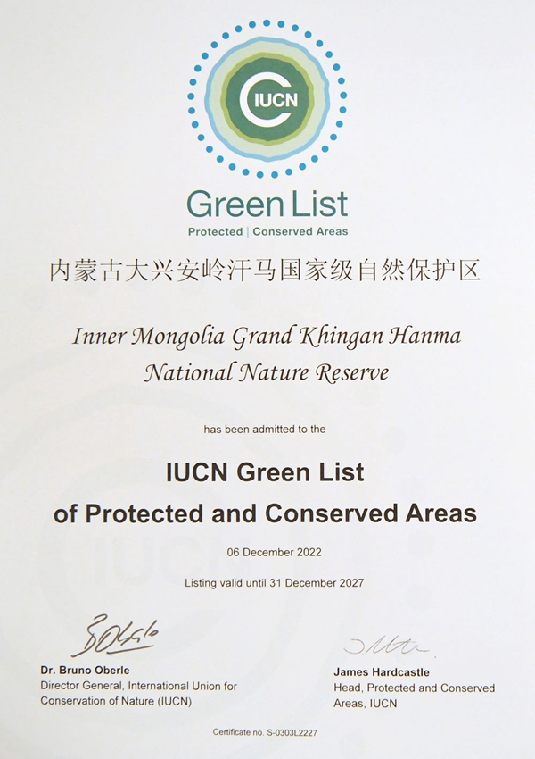 这是在加拿大蒙特利尔拍摄的内蒙古大兴安岭汗马国家级自然保护区获得的世界自然保护联盟绿色名录证书(2022年12月14日摄)。新华社记者 任鹏飞 摄