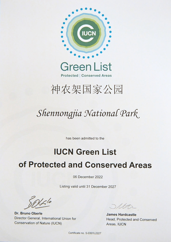 这是在加拿大蒙特利尔拍摄的神农架国家公园获得的世界自然保护联盟绿色名录证书(2022年12月14日摄)。新华社记者 任鹏飞 摄