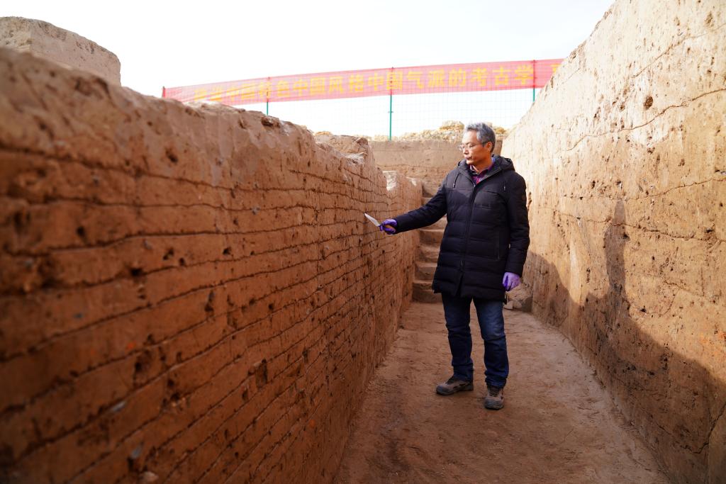 12月16日,考古人员正在研究河北柏人城遗址内的夯土层。(陈雷摄)