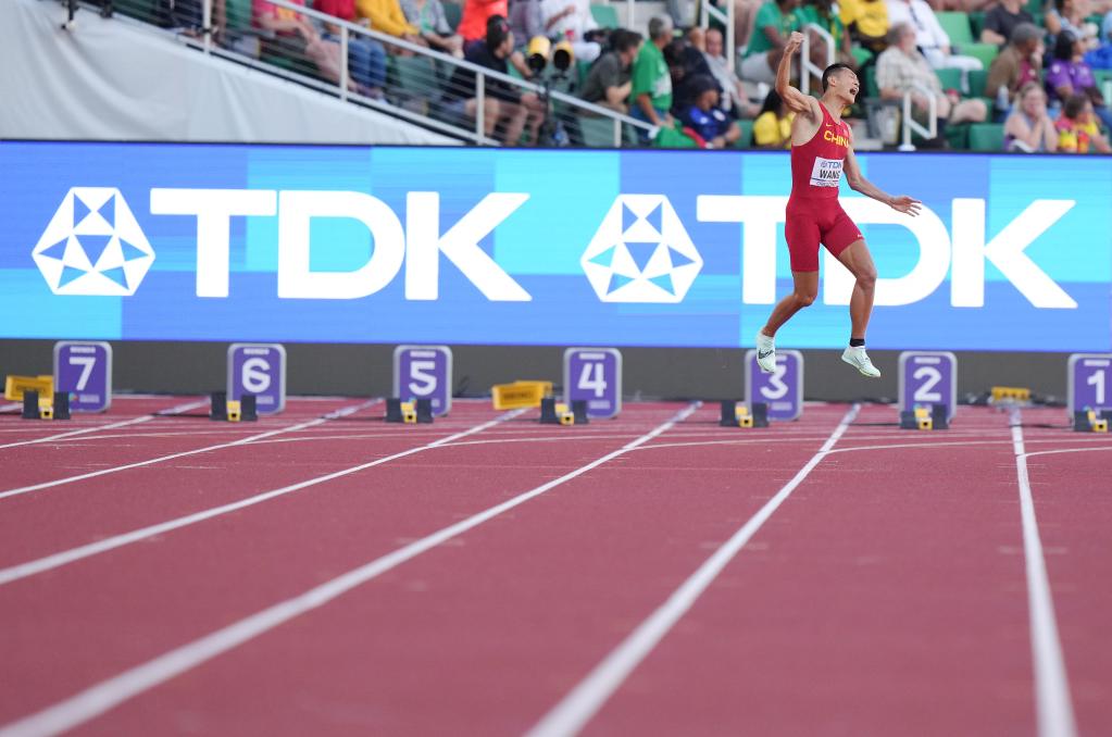 7月16日,王嘉男在最后一次试跳后庆祝。新华社记者王迎摄