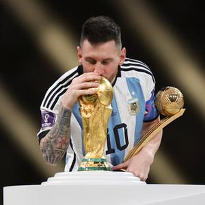 12月18日,获得世界杯金球奖的阿根廷队球员梅西在卡塔尔世界杯足球赛颁奖仪式上亲吻大力神杯。新华社记者曹灿摄
