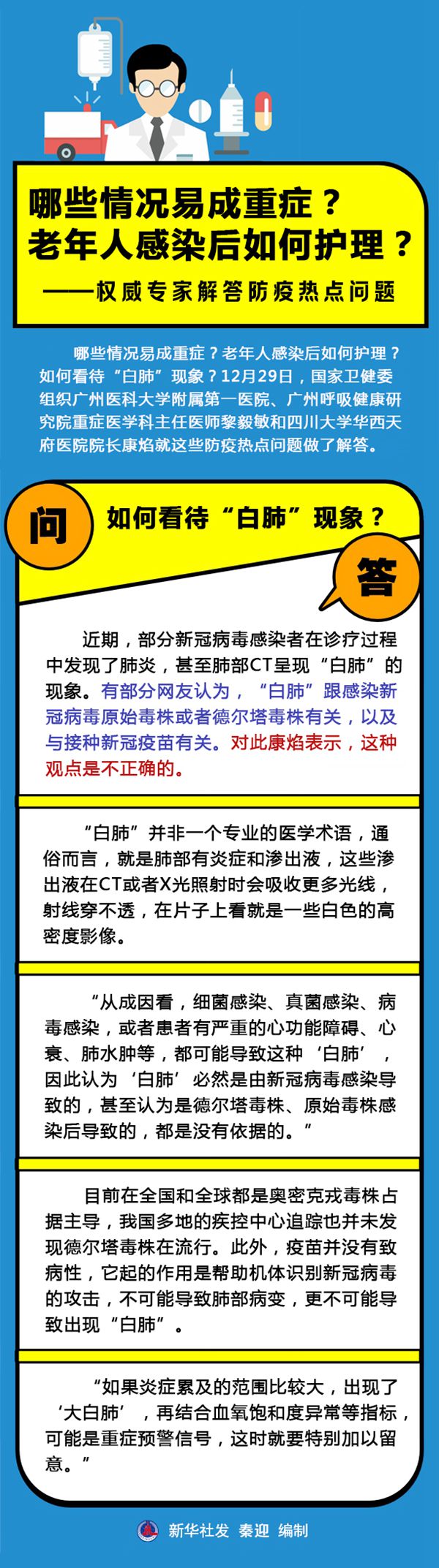 哪些情况易成重症?老年人感染后如何护理?如何看待“白肺”现象?12月29日,国家卫健委组织广州医科大学附属第一医院、广州呼吸健康研究院重症医学科主任医师黎毅敏和四川大学华西天府医院院长康焰就这些防疫热点问题做了解答。