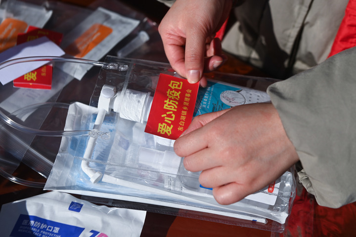 12月20日,在浙江省诸暨市东白湖镇东白山村村委会,爱心志愿团的志愿者们在分装爱心防疫包。新华社记者 徐昱 摄
