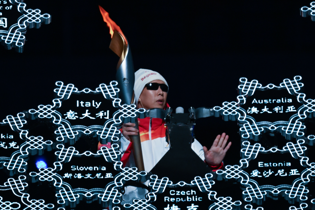 3月4日晚,最后一棒火炬手李端在北京冬残奥会开幕式上摸索火炬嵌入的位置。新华社记者 李尕 摄