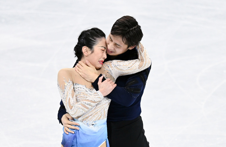 2月19日,中国选手隋文静(左)/韩聪在比赛中。当日,北京2022年冬奥会花样滑冰双人滑自由滑比赛在首都体育馆举行,中国选手隋文静/韩聪夺得双人滑冠军。新华社记者 李尕 摄