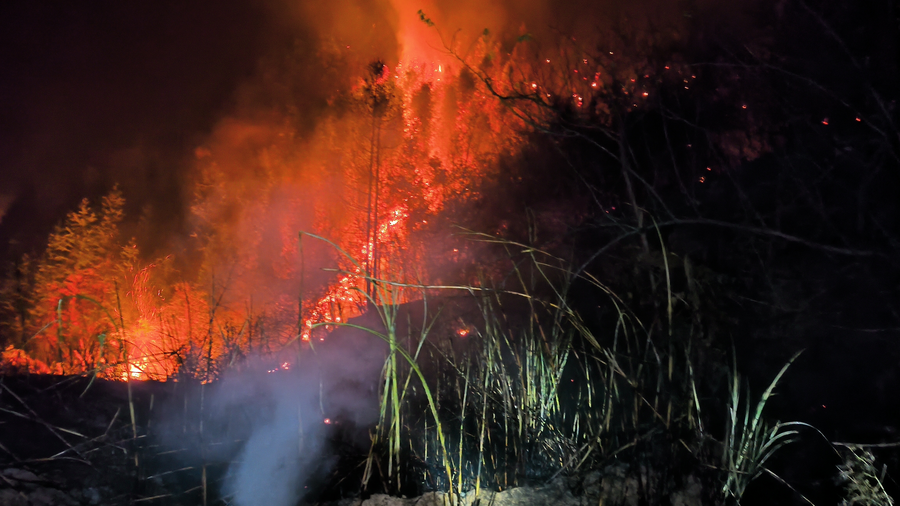 10月21日,湖南省永州市新田县发生森林火灾现场。5750人的专业森林消防队伍在灭火一线日夜奋战。