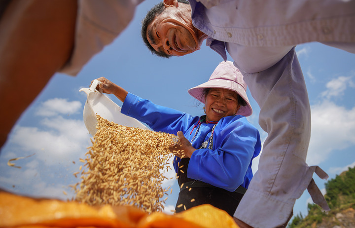 9月17日,在贵州省黔东南苗族侗族自治州丹寨县金泉街道,村民将晾晒好的稻谷装袋。新华社发(黄晓海 摄)