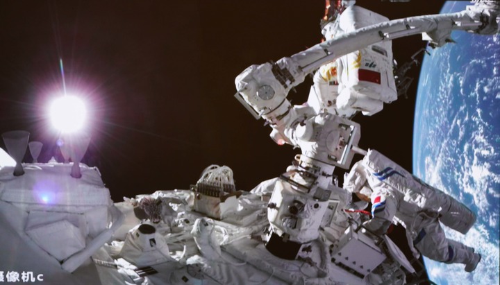 9月17日在北京航天飞行控制中心拍摄的神舟十四号航天员蔡旭哲(上)、陈冬(下)同时在舱外操作的画面。新华社记者 郭中正 摄