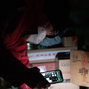 12月15日,在北京市大兴区新源时代小区,快递小哥高兴兴打开手机手电筒查看包裹信息。新华社记者 陈钟昊 摄