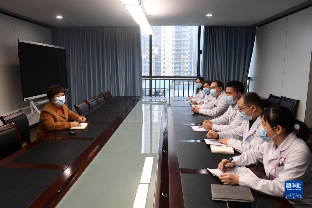 在广西壮族自治区妇幼保健院,杜丽群(左一)和医院医生交流征集有关药品价格的情况(2月16日摄)。