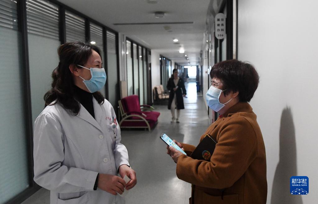 在广西壮族自治区妇幼保健院,杜丽群(右)和邹林霞医生交流征集有关药品降价的建议(2月16日摄)。