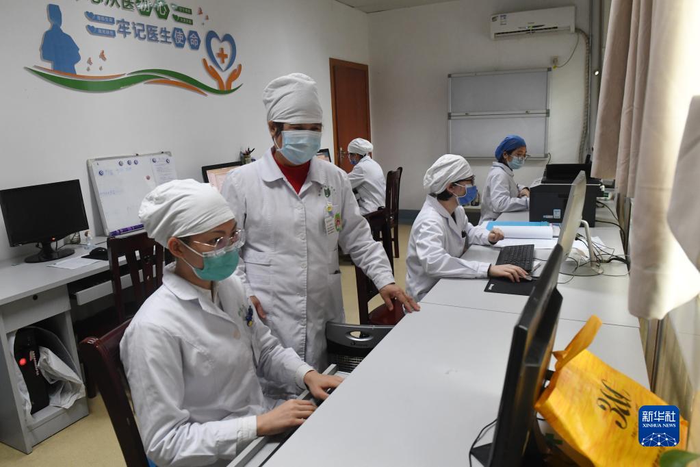 在广西南宁市第四人民医院,杜丽群(左二)和医生交流病人用药情况(2月16日摄)。