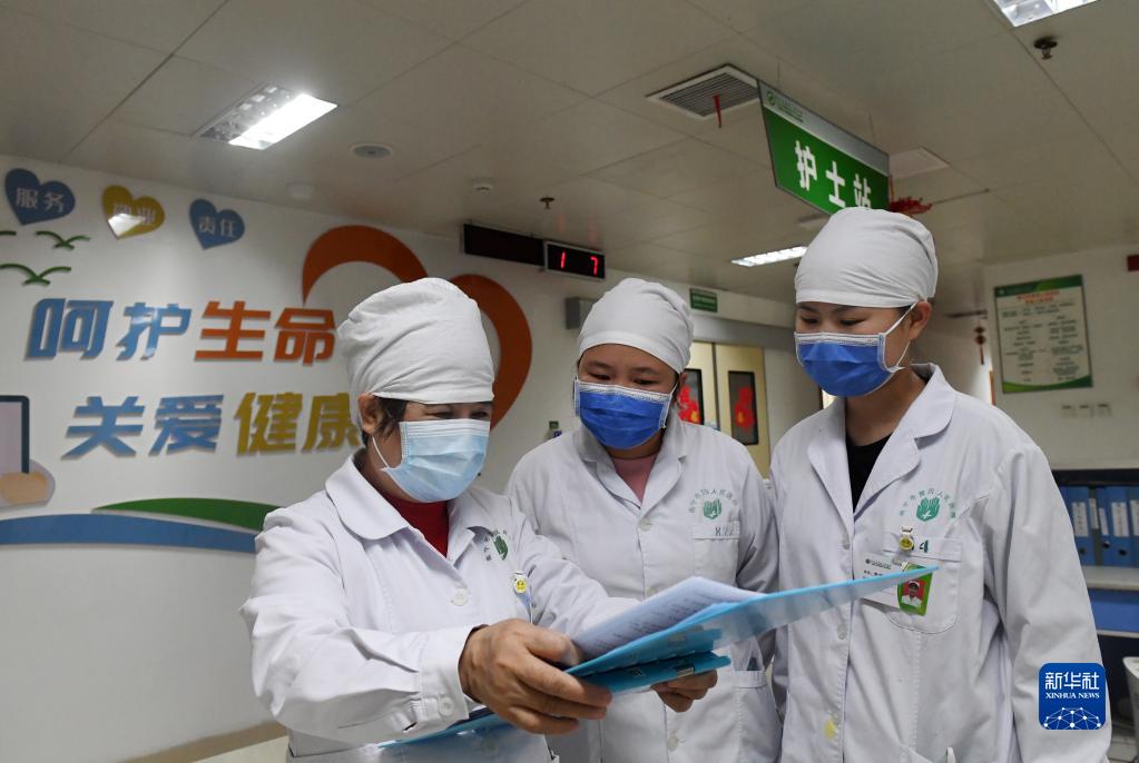 在广西南宁市第四人民医院,杜丽群(左)和护士交流病人用药情况(2月16日摄)。