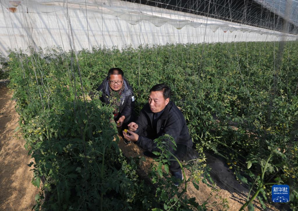 2月15日,郭凯(右)在盘山县太平街道办事处张家村一处大棚查看作物生长情况。
