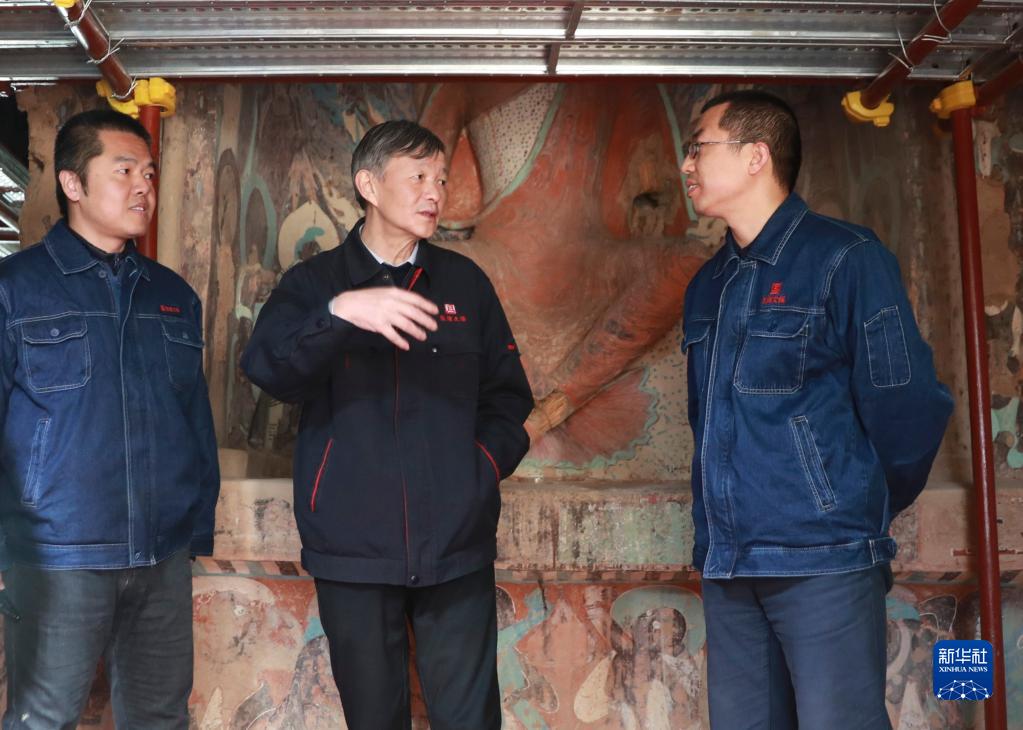 2月23日,苏伯民(中)和敦煌研究院技术人员在莫高窟第254窟讨论文物修复情况。