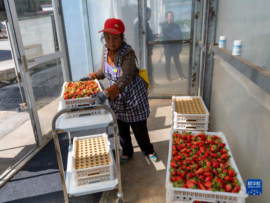 3月3日,村民在会泽县待补镇一草莓种植基地装草莓。