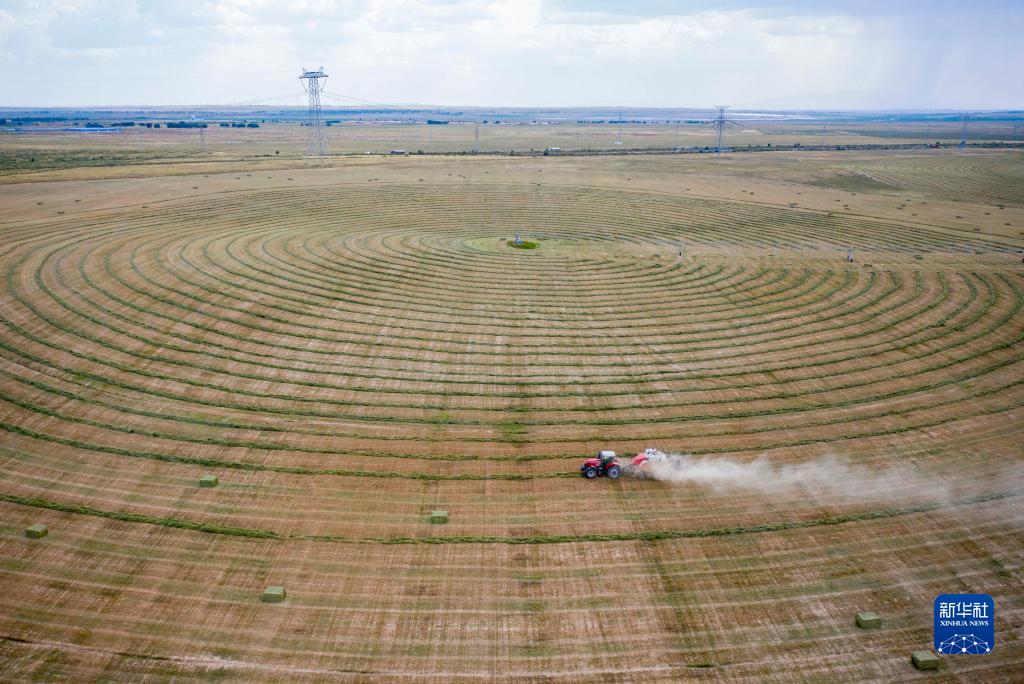 在宁夏盐池县冯记沟乡平台村的优质牧草基地,农户用机械将牧草打捆(无人机照片,2021年7月14日摄)。
