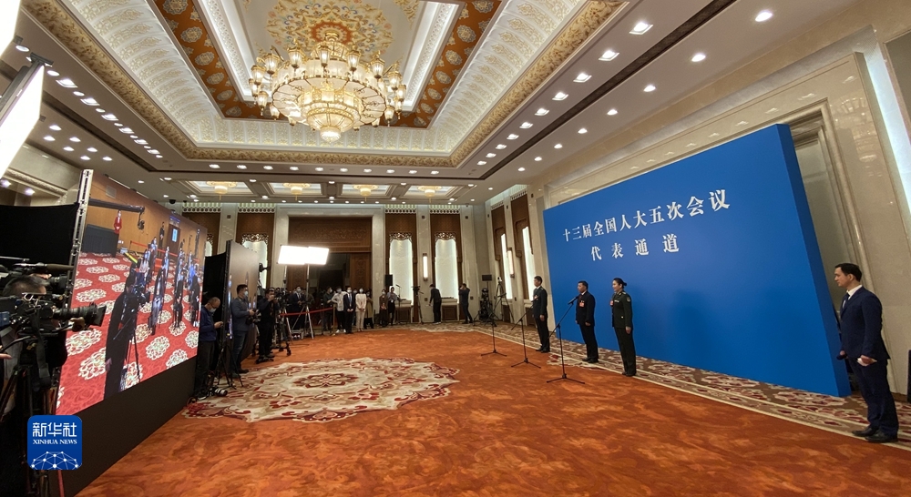 3月5日,第十三届全国人民代表大会第五次会议举行首场“代表通道”采访活动。这是全国人大代表通过网络视频方式接受采访。 记者 王翰林 摄