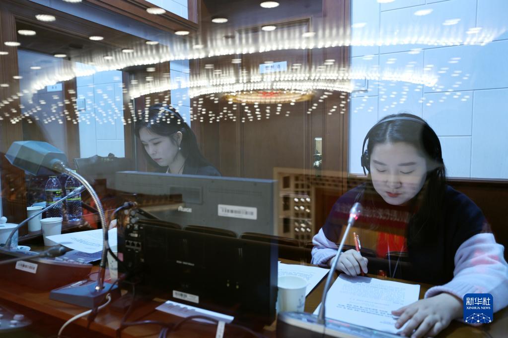 3月5日,第十三届全国人民代表大会第五次会议在北京人民大会堂开幕。这是工作人员在现场进行少数民族语言同声传译。