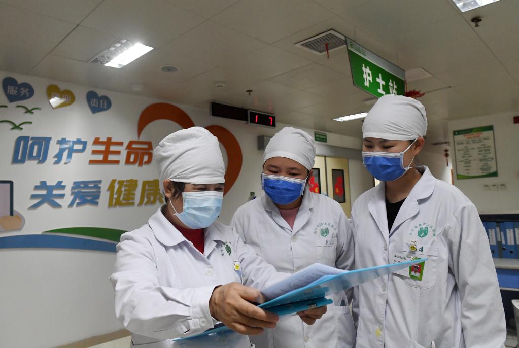 在广西南宁市第四人民医院,杜丽群(左)和护士交流病人用药情况。新华社记者 陆波岸 摄