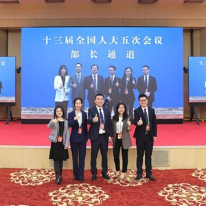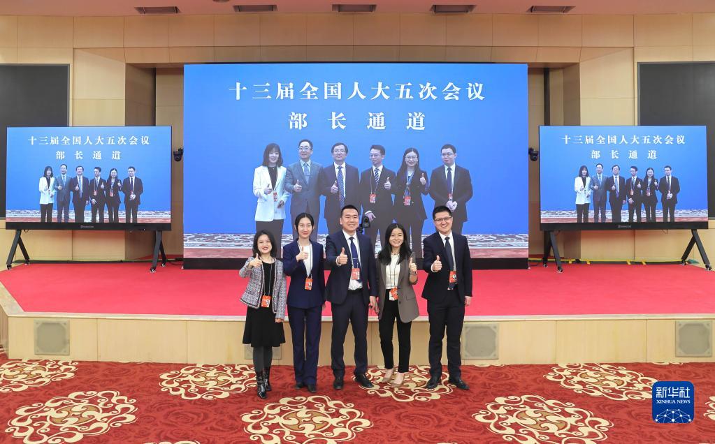 3月8日,第十三届全国人民代表大会第五次会议举行第二场“部长通道”采访活动。这是活动结束后,梅地亚中心分会场的工作人员(前)和人民大会堂主会场的工作人员(屏幕中)通过网络视频方式合影留念。