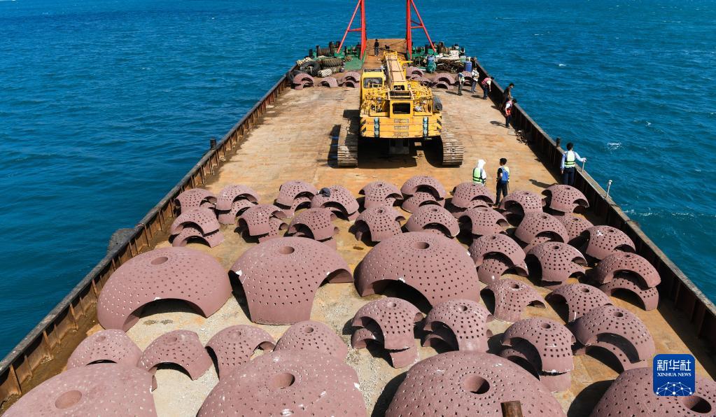 运输船来到海南省三亚市亚龙湾相关海域,准备将人工生态礁投入海中(1月18日摄)。