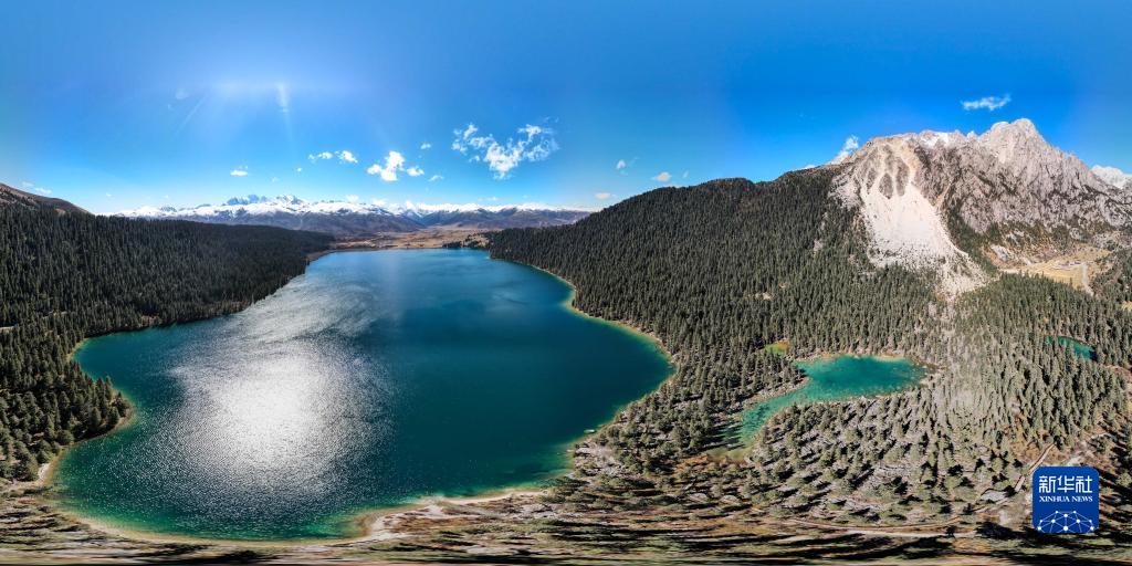 这是2021年10月24日在四川甘孜巴塘县措普沟景区内拍摄的措普湖(无人机全景照片)。