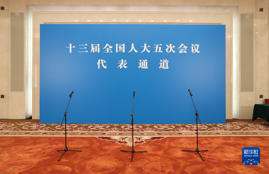 3月8日,十三届全国人大五次会议第二次全体会议开始前举行“代表通道”采访活动,邀请部分全国人大代表通过网络视频方式接受采访。图为代表通道现场。新华网 焦鹏 摄