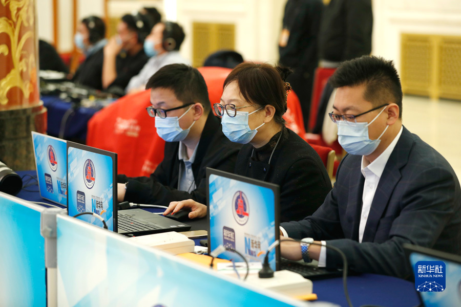 3月11日,十三届全国人大五次会议闭幕后,国务院总理李克强在人民大会堂三楼金色大厅出席记者会并回答中外记者提问。图为新华网直播团队正在记者会现场工作。新华网 焦鹏 摄