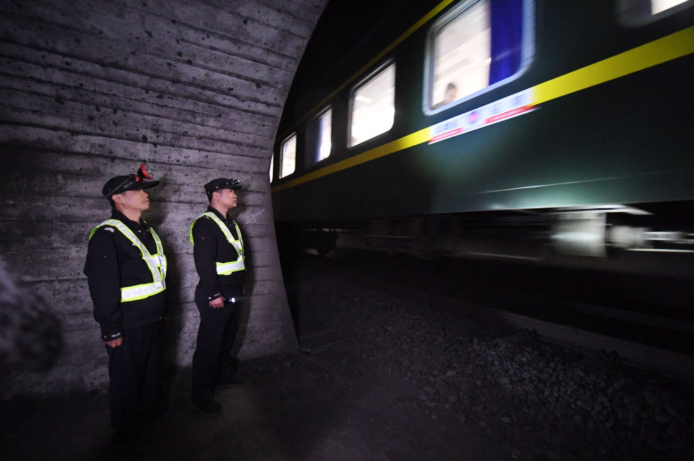 ↑2021年2月20日,李彬(右)和辅警潘永新在米花岭隧道内巡逻时,躲进避风洞避让驶过的列车。