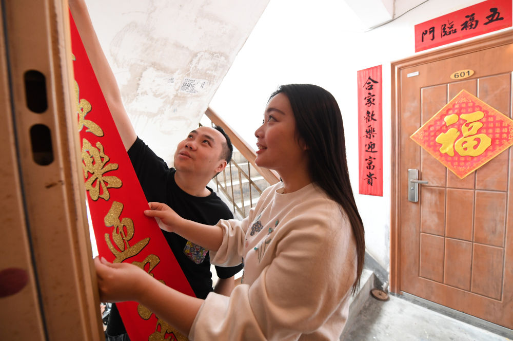 ↑2019年2月3日,赵云鹏和妻子陆静芸在家门口贴春联。