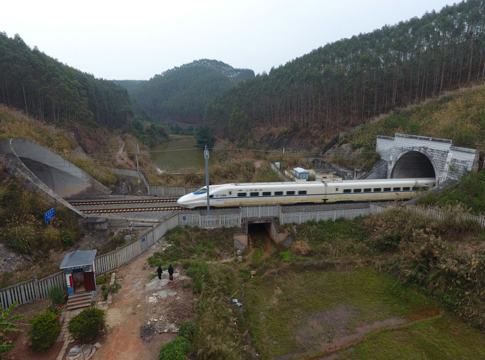 ↑2018年2月11日,一列动车穿越花甲山隧道从岗亭外飞驰而过。