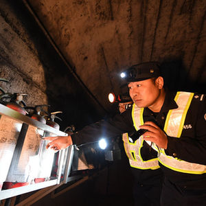 ↑2021年2月20日,李彬在米花岭隧道内巡逻时检查消防设施。