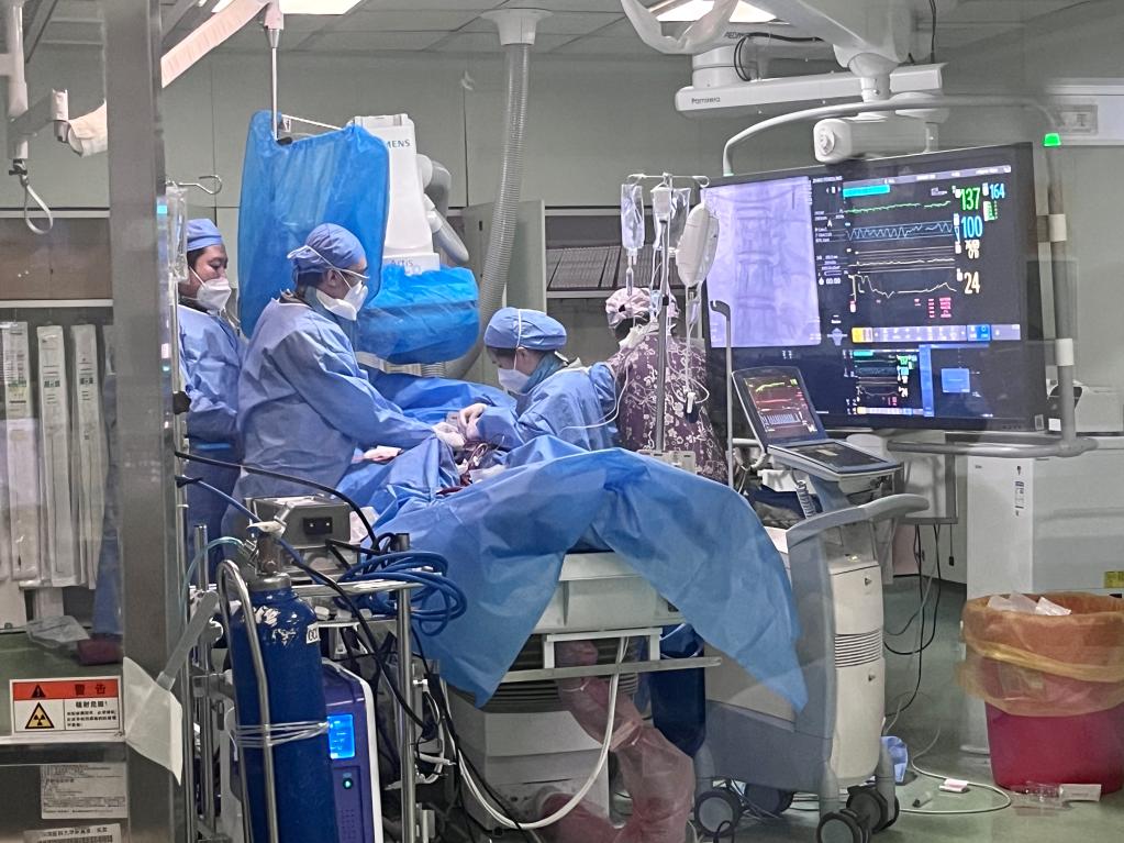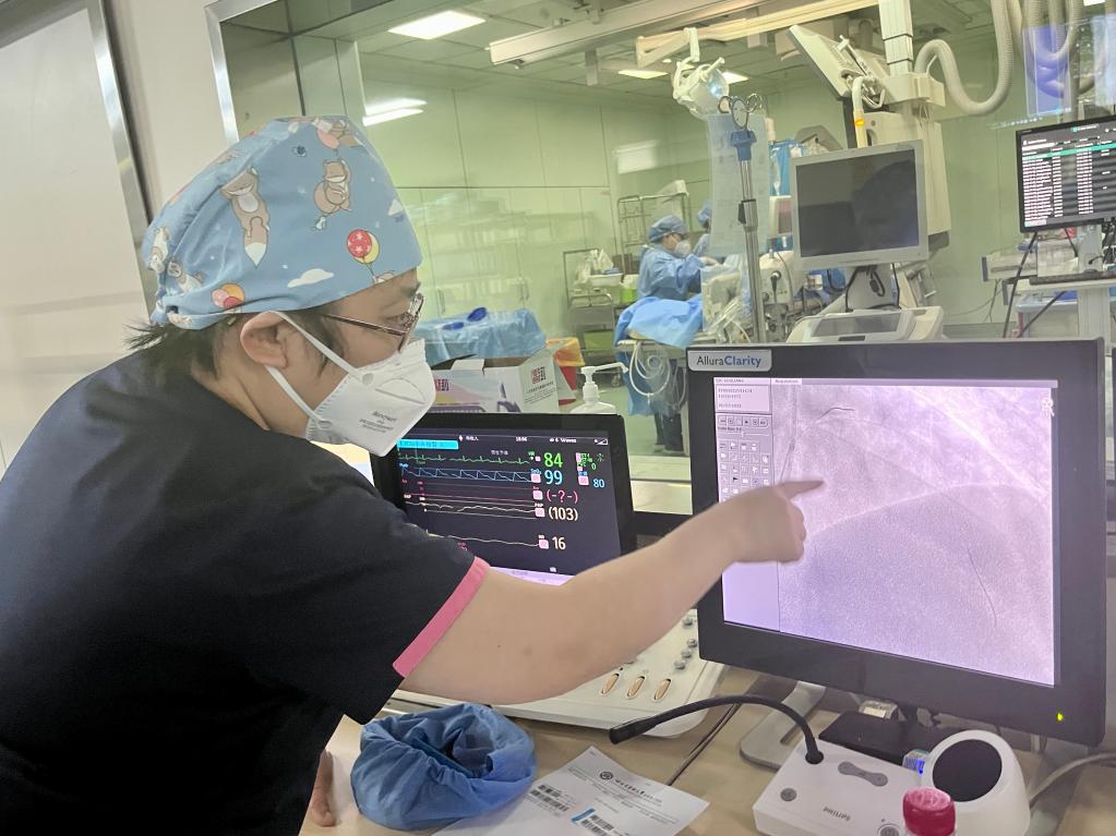 医护人员在导管室内对患者进行救治。(新华社记者杨思琪摄)