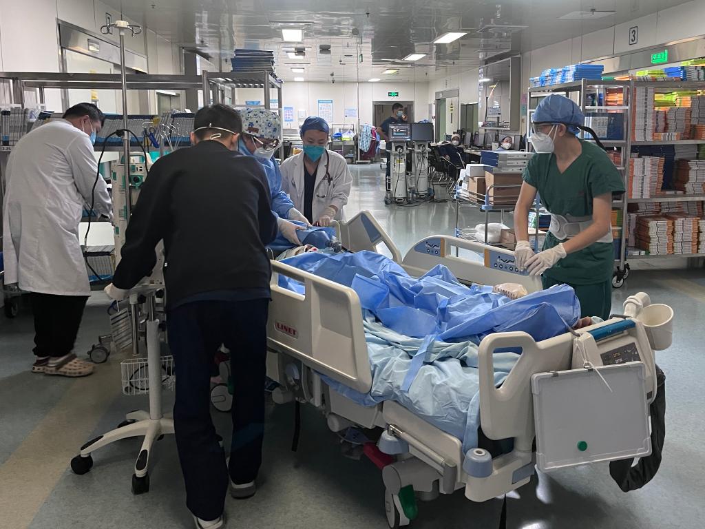 医护人员将患者从导管室内推出。(新华社记者杨思琪摄)