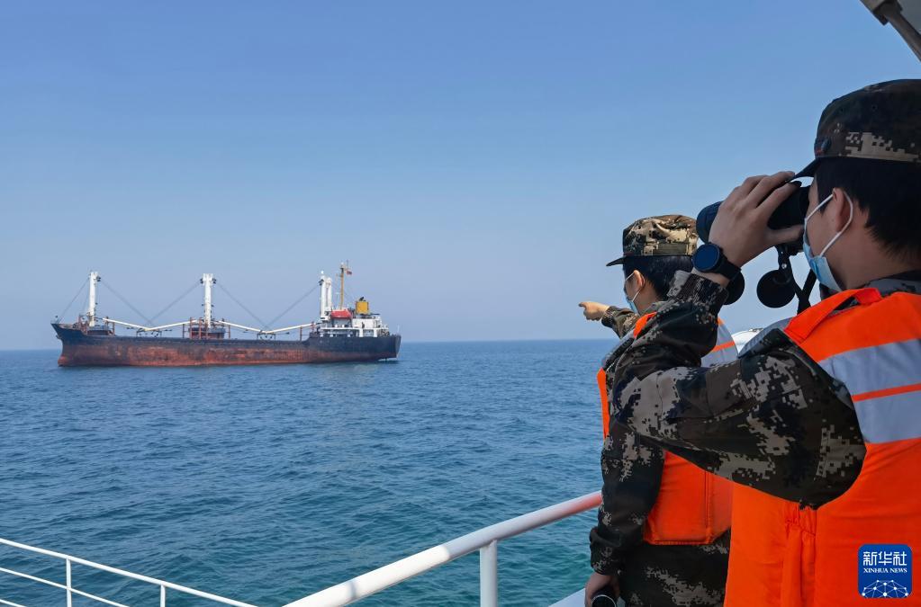 山东海警局执法员巡航过程中对嫌疑船舶进行瞭望监视(2022年4月7日摄)。新华社发(卢煜萱 摄)