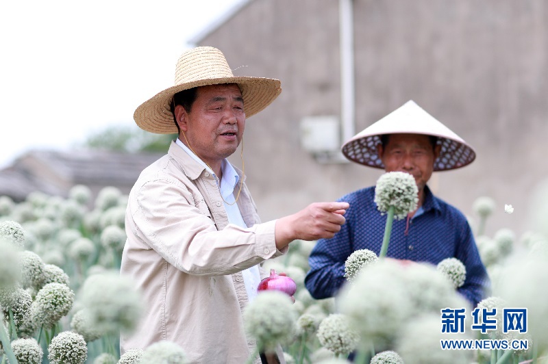 江苏省兴化市大营镇联镇村洋葱基地,李廷胜(左)在田间与葱农交流洋葱苗生长情况。