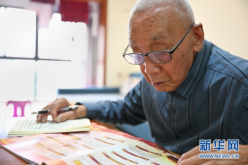 舒服民老人在位于海南澄迈的家中学习二十大精神。