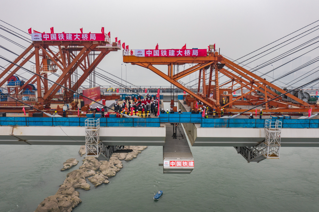 1月12日,由中国铁建大桥局承建的重庆轨道交通18号线关键控制性工程——李家沱长江复线桥成功合龙。无人机照片。新华社记者 黄伟 摄
