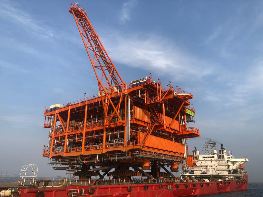 1月9日,渤中29-6油田开发项目WHPA平台完成连接调试并顺利通过机械完工验收,该项目是我国海洋油气装备“智能制造”的试点示范项目。图片由中国海油提供。