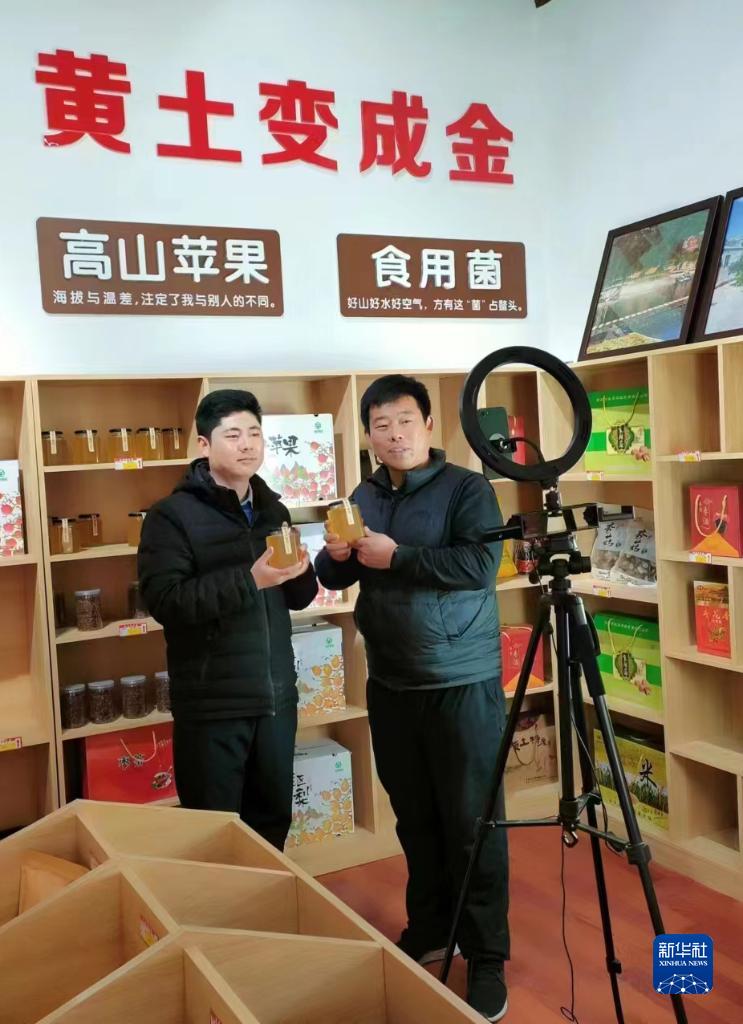 2022年11月6日,在河北省阜平县顾家台村的电商直播间,顾家台村第一批返乡创业的“90后”青年顾腾飞(右)在直播卖货。新华社发(曹建平 摄)