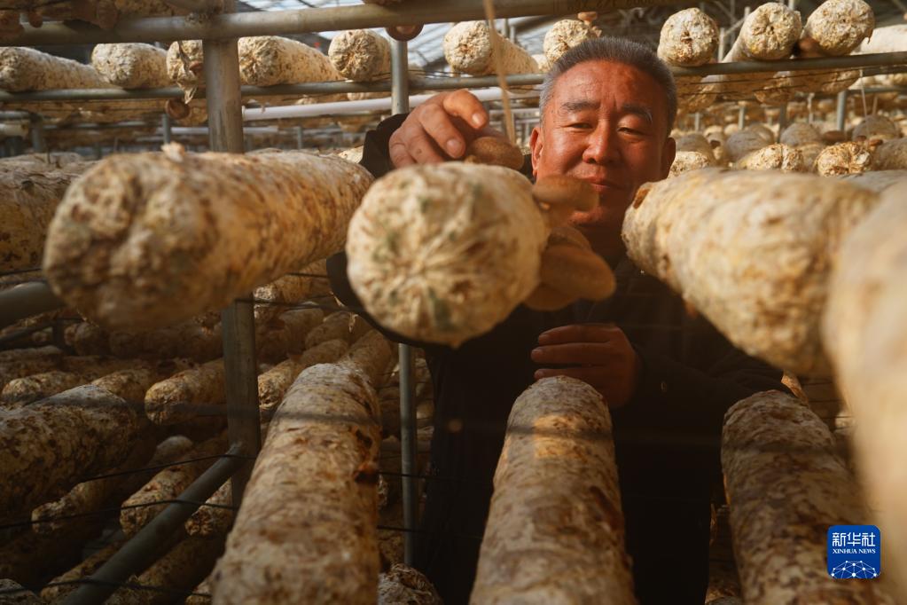 2022年12月26日,在河北省阜平县色岭口村,村民顾军在食用菌大棚采摘香菇。新华社发(李秀芹 摄)