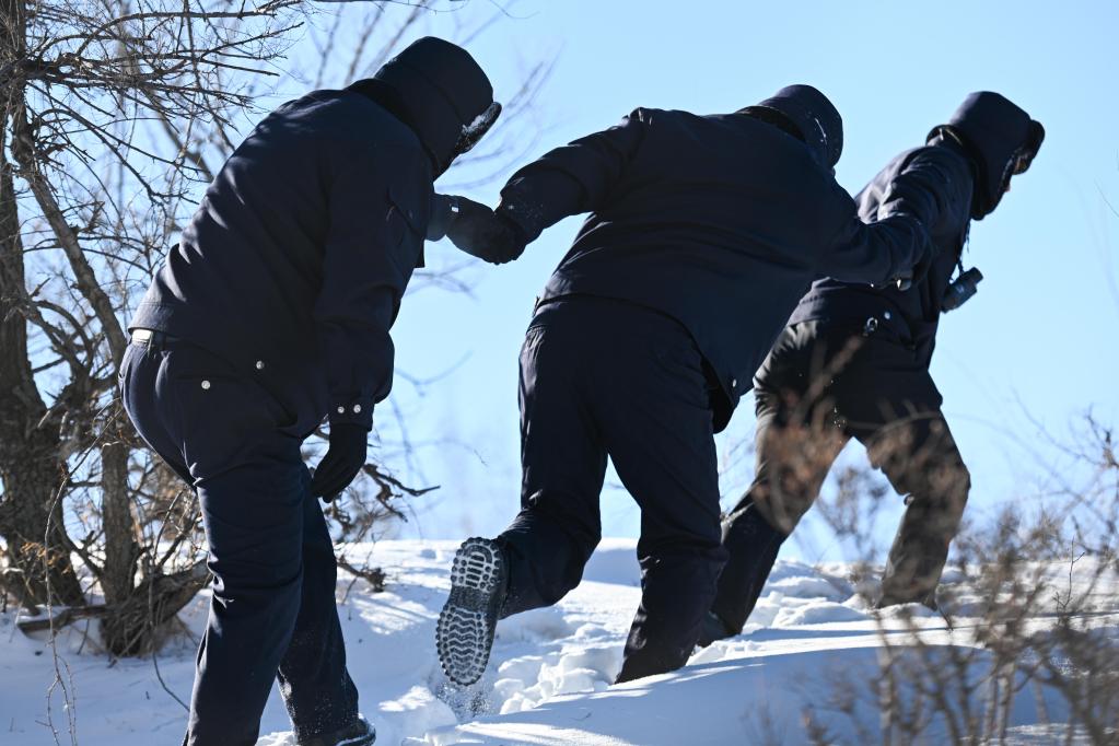 西乌珠穆沁旗公安局古日格斯台国家级自然保护区迪彦派出所民警在林区雪地相互搭手前进。新华社记者王泽聪 摄