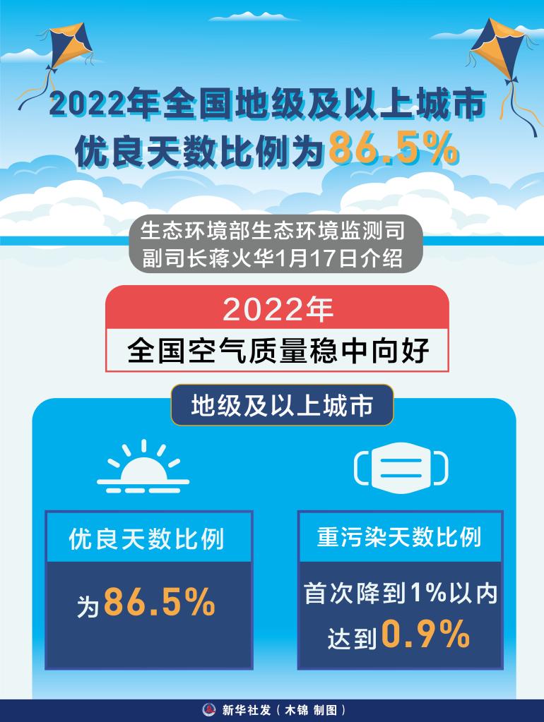新华社北京1月17日电(记者 高敬)生态环境部生态环境监测司副司长蒋火华17日介绍,2022年,全国空气质量稳中向好,地级及以上城市优良天数比例为86.5%;重污染天数比例首次降到1%以内,达到0.9%。