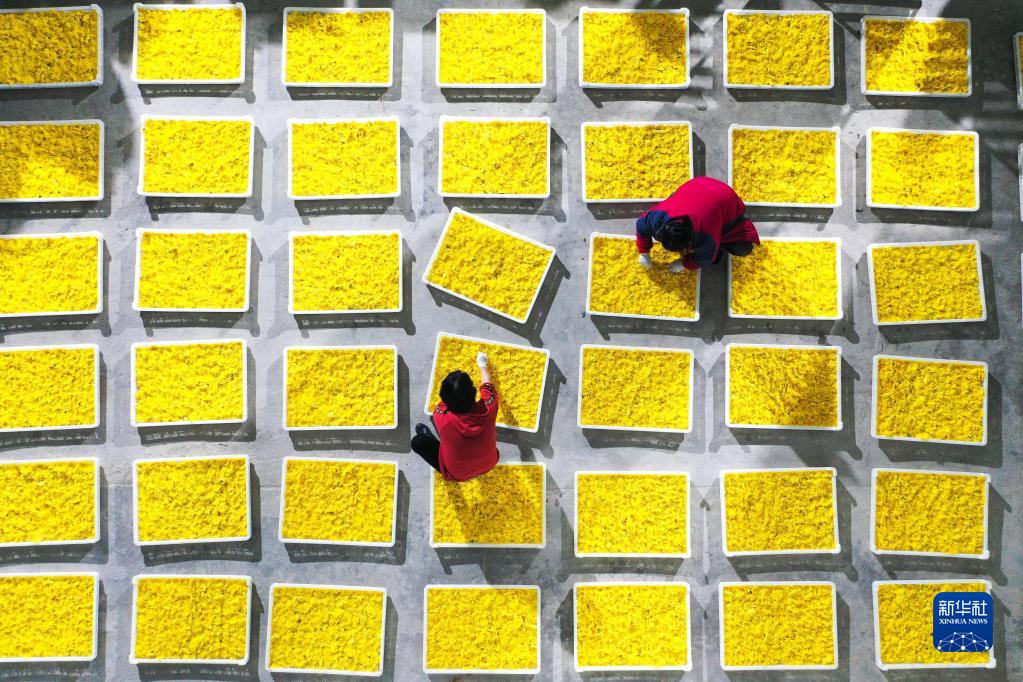 村民在贵州省贵定县云雾镇一菊花加工车间摊晾金丝皇菊(2022年10月20日摄,无人机照片)。新华社记者 杨文斌 摄