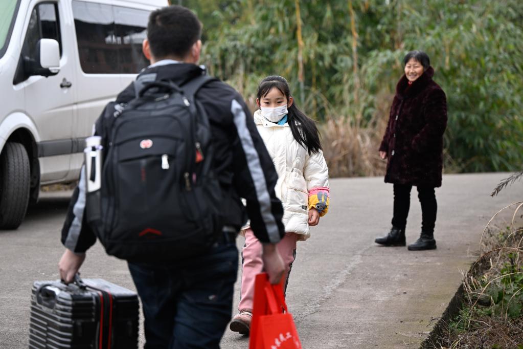 1月15日,女儿廖欣妍看到廖大友后,飞奔过来帮他拿行李。新华社记者胥冰洁 摄