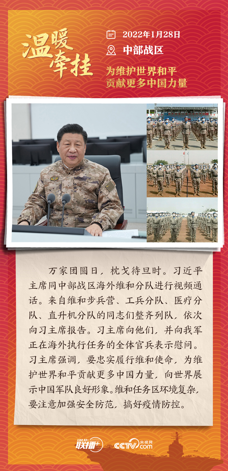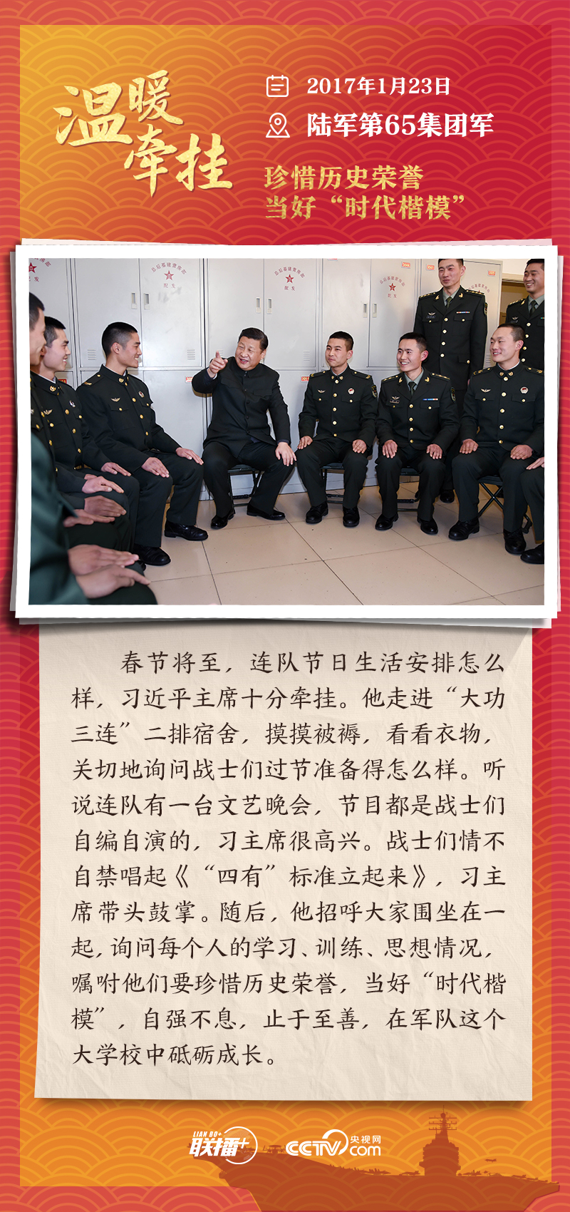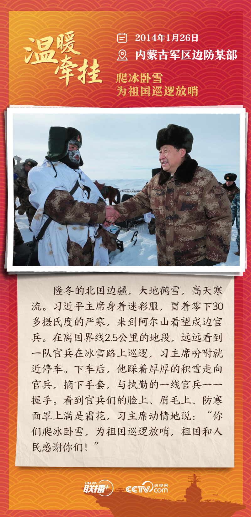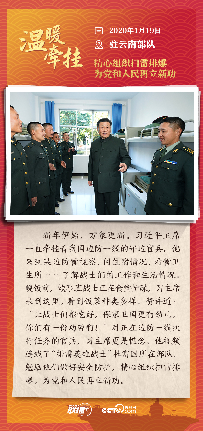 编者按:“大国之大,也有大国之重。千头万绪的事,说到底是千家万户的事。”从2013年起,每逢春节前夕,习近平总书记都会来到群众身边,拉家常、问冷暖,听民声、送祝福。央视网《联播+》特推出“温暖牵挂”系列,与您一同重温总书记与大家在一起的温暖故事,感受浓浓的领袖情怀。