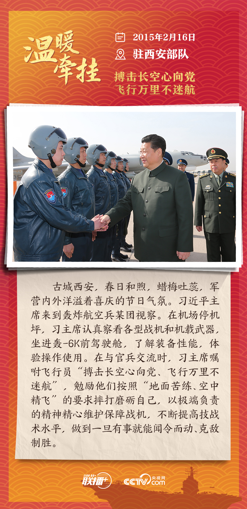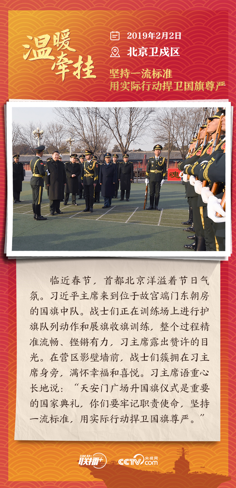 踏边关、走戈壁、入班排、看哨所……党的十八大以来,每逢新春佳节到来之际,即使行程再满,习近平主席也会留出时间来到军营、训练场或边防线,看望或亲切接见驻地部队官兵,代表党中央和中央军委,向全体人民解放军指战员、武警部队官兵、民兵预备役人员致以诚挚问候和新春祝福。