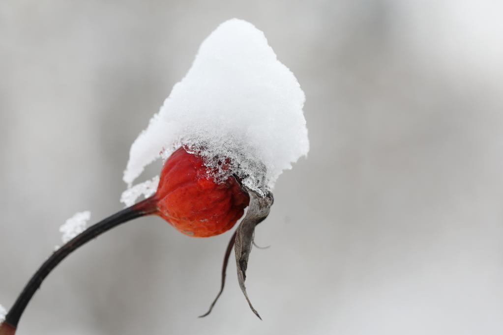 河南省焦作市温县,月季花果实与白雪相映成趣。新华社发(徐宏星摄)